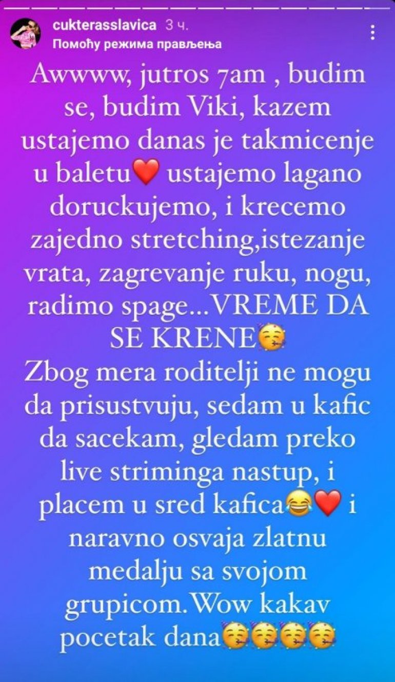 - Zbog mera roditelji ne mogu da prisustvuju, sedam u kafić da sačekam, gledam preko lajv strima nastup i plačem usred kafića. Naravno, osvaja zlatnu medalju sa svojom ekipom. Vau, kakv početak dana - napisala je Slavica.