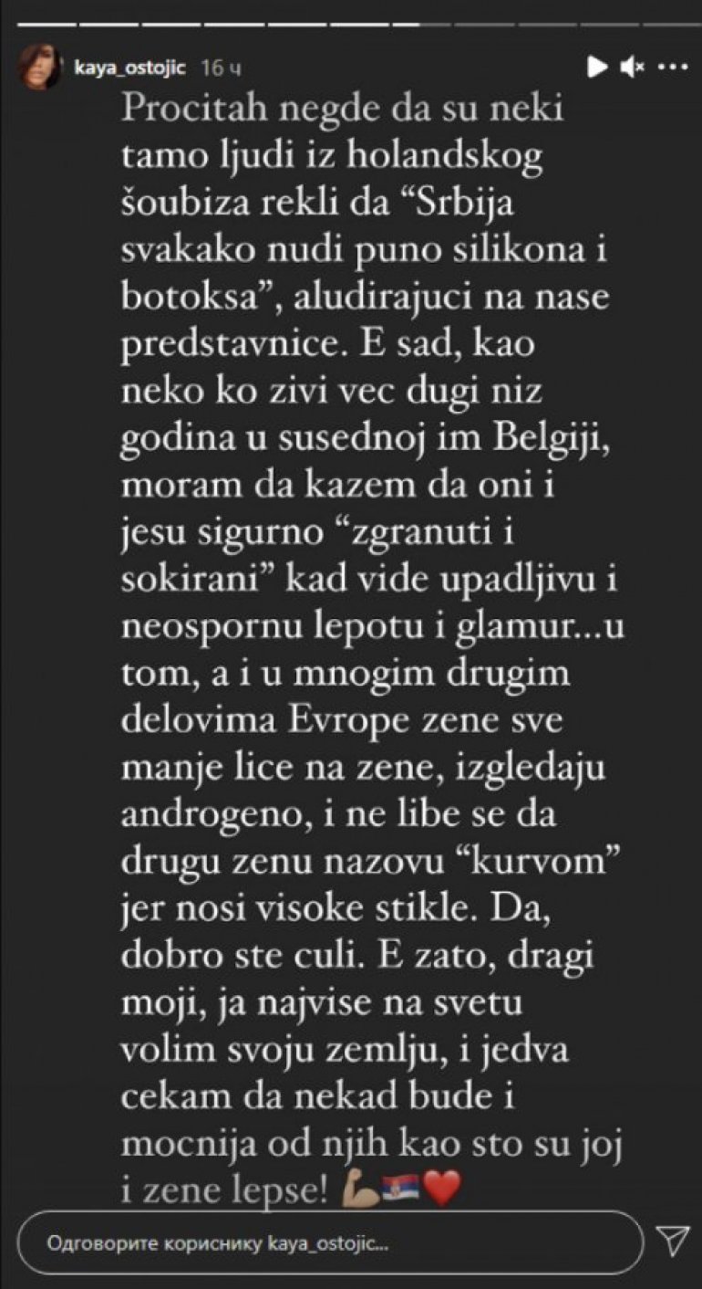 Tviteraši su istakli i da je jedan od negativnih komentara ostavila "propala pevačica Karin Bloemen", a na to je reagovala i Kaja Ostojić.