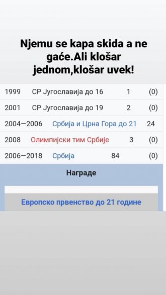 Rezervni golman Partizana Nemanja Stevanović se javnosti obratio putem Instagrama, pa je uz priloženu fotografiju fudbalske biografije Vladimira Stojkovića i njegovog staža u reprezentaciji napisao: