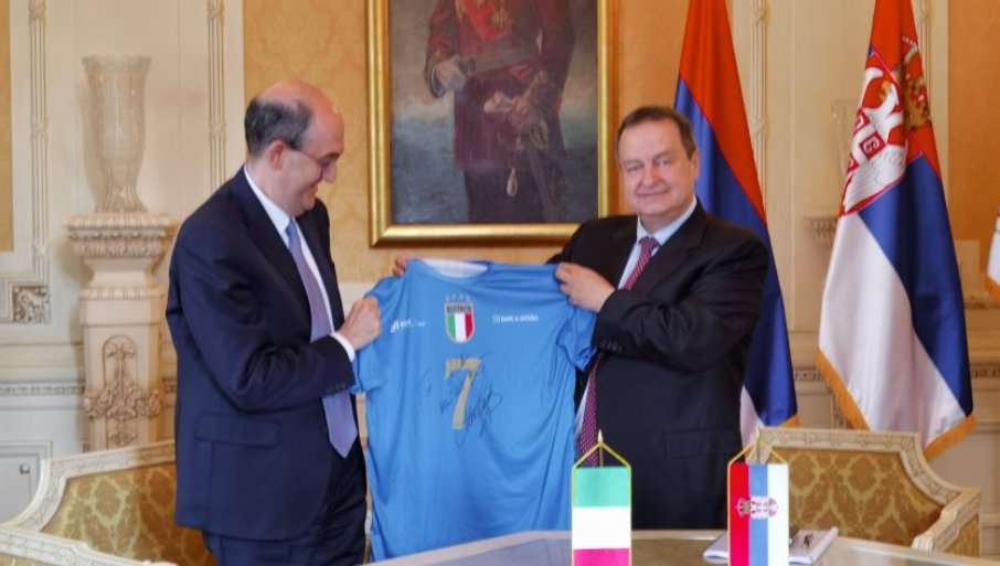 Predsednik Narodne skupštine Ivica Dačić tokom susreta sa ambasadorom Italije u Srbiji Karlom Lo Kašom, dobio je dres koji mu je poslao legendarni kapiten Juventusa Alesandro Del Pjero.