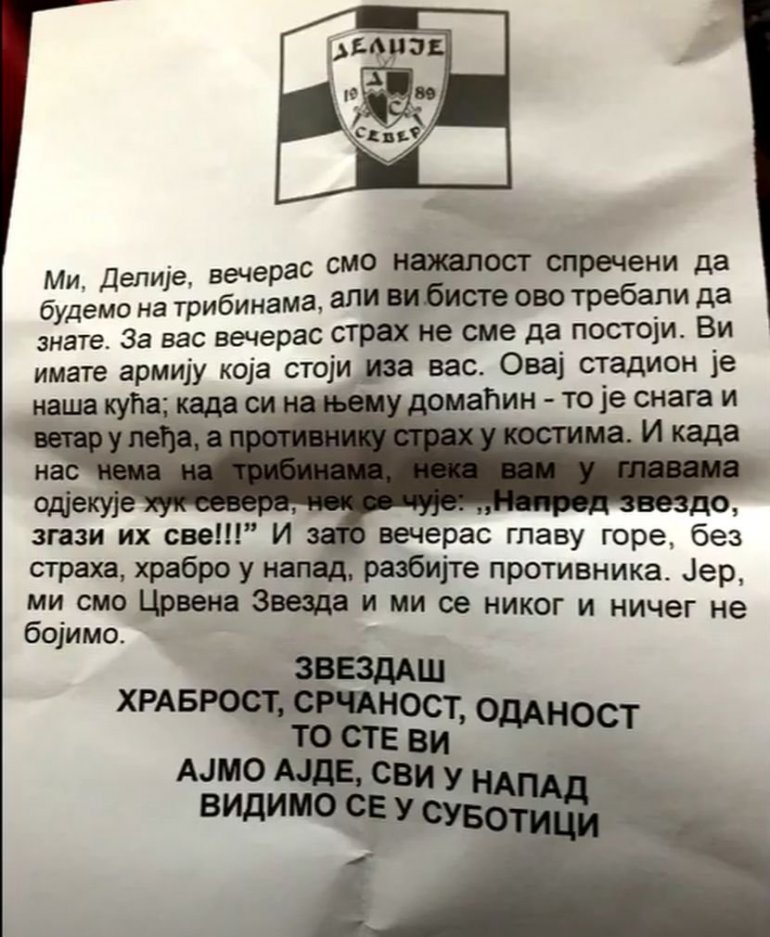 U poruci "Delije" pominju grb kluba, borbu, stadion...