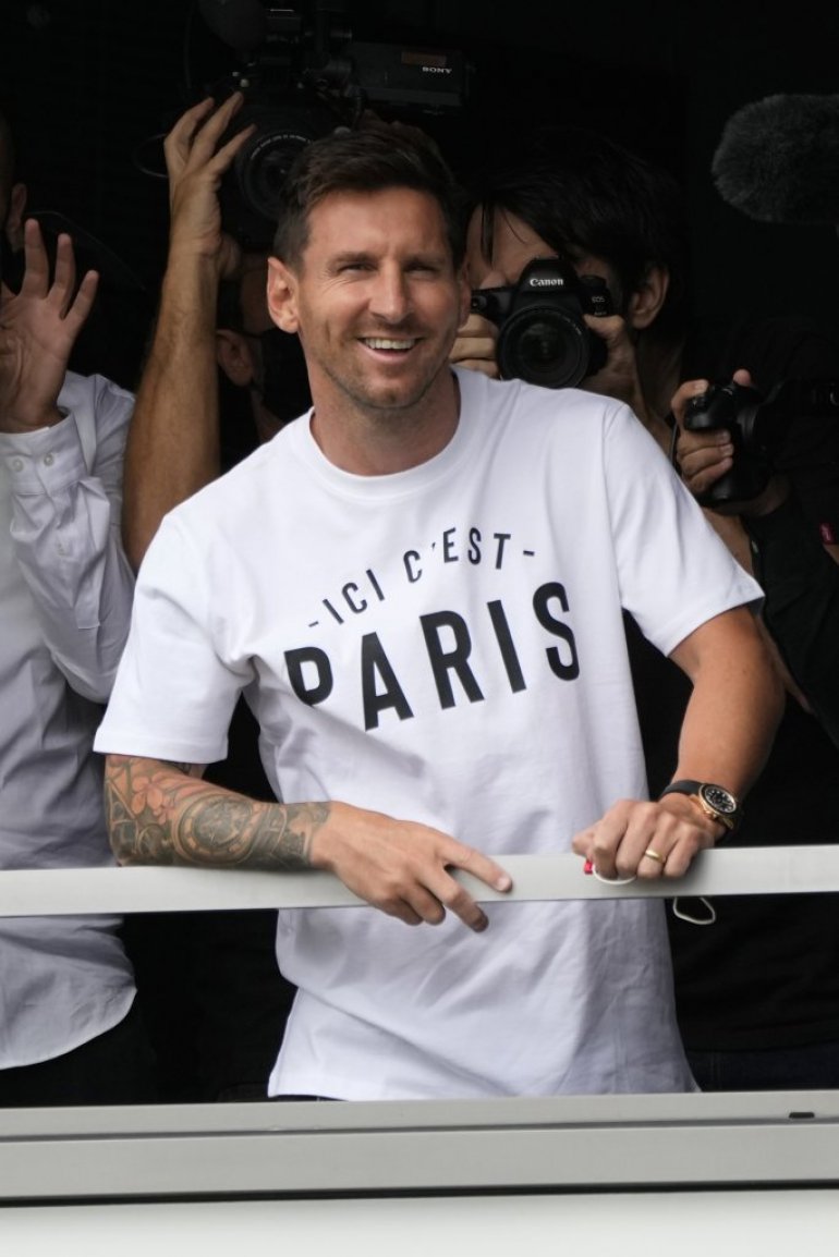 Bilo je tačno 15.52 kada se argentinski fudbalski mag pojavio na prozoru aerodromske zgrade u Buržeu gde sleću privatne letelice. Odatle je nekoliko minuta mahao stotinama okupljenih pristalica koje su oduševljeno uzvikivale njegovo ime. Nasmejan, na sebi je imao majicu s natpisom "Ovo ovde je Pariz", koja je sve govorila sama za sebe.