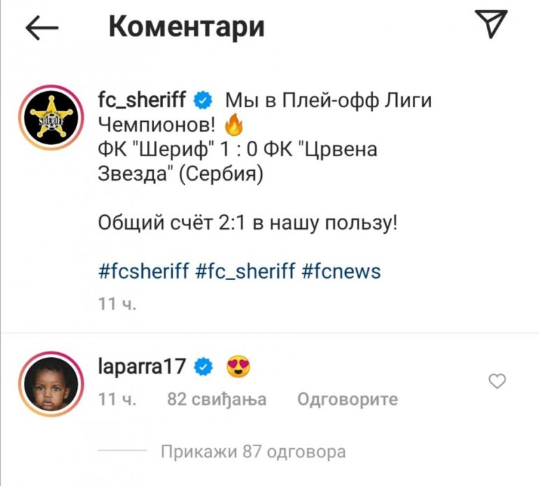 Holanđanin je učestvovao u komentarisanju objave na zvaničnom Instagram profilu moldavskog šampiona i sudeći po vrsti emodžija koji je upotrebio, sviđa mu se rezultat jučerašnjeg susreta u Tiraspolju.