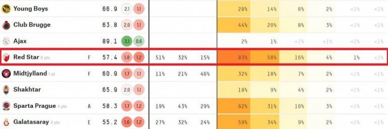 Primera radi, Zvezdi se daju veće šanse za plasman u četvrtfinale nego što ih imaju Dinamo Zagreb, Galatasaraj, Sparta Prag, Klub Briž, Genk, Legija, MIdtjiland, pa čak i brojni klubovi iz Lige šampiona koji bi mogli da nastave takmičenje u Ligi Evrope, poput Milana, Viljareala, Intera...