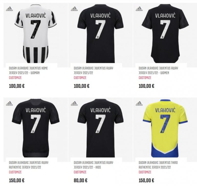 Juventus je svojim navijačima ponudio ukupno 12 različitih vrsta dresova Vlahovića, i to u vidu crno-bele, crne i žuto-plave kombinacije i za "Autentik" verziju ove sportske opreme, i za "domaću garnituru", i za žensku verziju dresa, i, konačno, za decu.