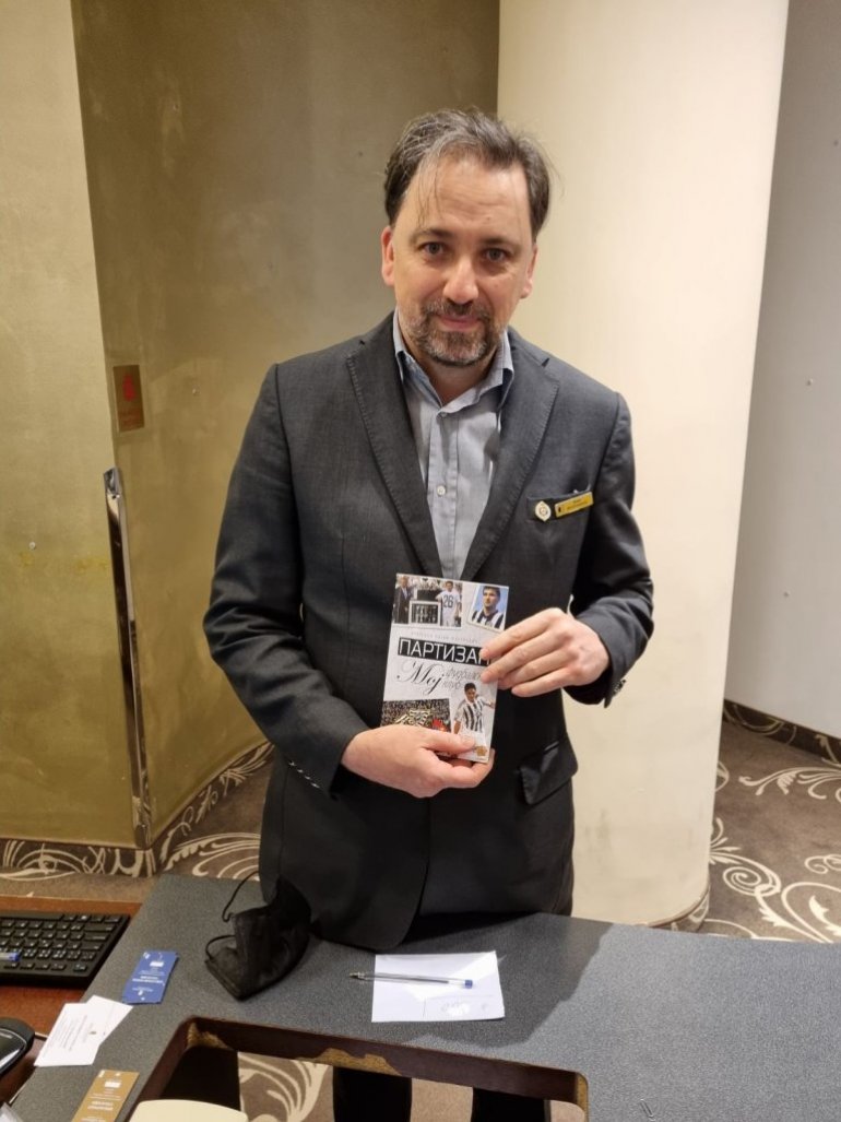 Dok spretno upućuje goste koji u grupama pristižu i deli kartice od soba kao na pokeraškom stolu, ovaj Beograđanin koji od 1999. živi u češkoj prestonici pripoveda nam zanimljivosti u vezi sa simbolom Partizana koji je priljubio uz srce.