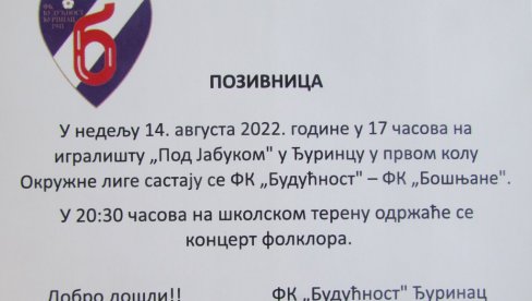 Na igralištu „Pod jabukom“ u Đurincu kod Svilajnca u prvom kolu Okružne lige sastaće se FK „Budućnost“ i FK „Bošnjane“. Oni će „odmeriti“ snage u nedelju, 14. avgusta, u 17 sati. Koncert folklora zakazan je za 20,30 sati na školskom terenu.