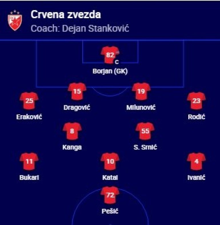 19.48 - A ovako UEFA predstavlja startnu postavu Crvene zvezde i njen položaj na terenu, dok šansu s klupe čekaju: Popović, Gobeljić, Leković, Stanković, Sanogo, Kangva, Nikolić, Ibrahim, Mitrović, Ben, Ohi i Pavkov.