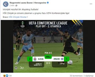 - Istorijski rezultat bh. klupskog fudbala! HŠK Zrinjski je ostvario plasman u grupnu fazu UEFA Konferencijske lige! Bravo HŠK Zrinjski Mostar - poručili su iz Fudbalskog saveza Bosne i Hercegovine.