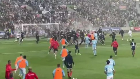 VELIKI haos izbio je tokom gradskog derbija koji su igrali Meblurn siti i Melburn Viktori, meč je prekinut zbog upada navijača na teren.