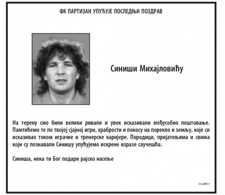 - Na terenu smo bili veliki rivali i uvek iskazivali veliko poštovanje. Pamtićemo te po tvojoj sjajnoj igri, hrabrosti i ponosu na poreklo i zemlju, koje si iskazivao tokom igračke i trenerske karijere. Porodici, prijateljima i svima koji su poznavali Sinišu upućujemo iskrene izraze saučešća. Siniša, neka ti Bog podari rajsko naselje - piše u čitulji.