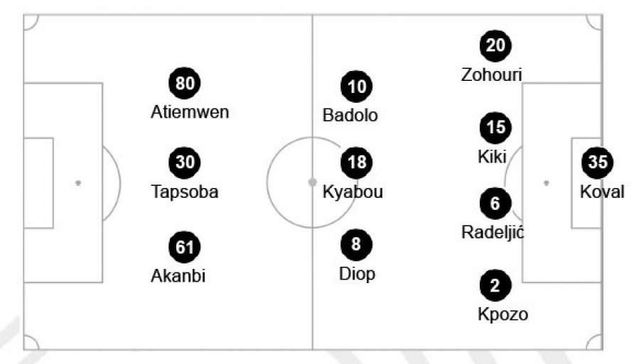 Šerif: Koval - Zohuri, Kiki, Radeljić, Kpozo - Badolo, Kjabu, Diop - Atiemven, Tapsoba, Akanbi