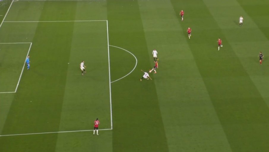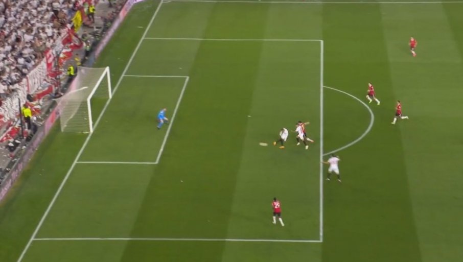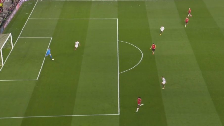 Iako je sekund ranije pogledao iza sebe, ka centru, i mogao da vidi da do sredine igrališta "nema žive duše" - loptu koju mu je golman poslao nije propustio, da ka centru nastavi da ide, pa i on za njom (čime bi iza sebe ostavio pomenuti Seviljin trio) - rešio je da doda levo od sebe, a desnom beku Junajteda, Van-Bisaki.