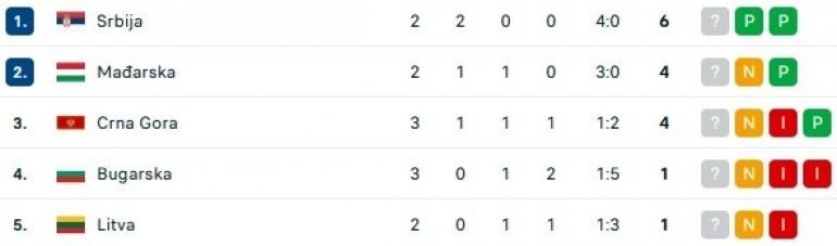 Srbija sada ima šest bodova, Mađarska i Crna Gora po četiri, Bugarska i Litvanija samo bod.