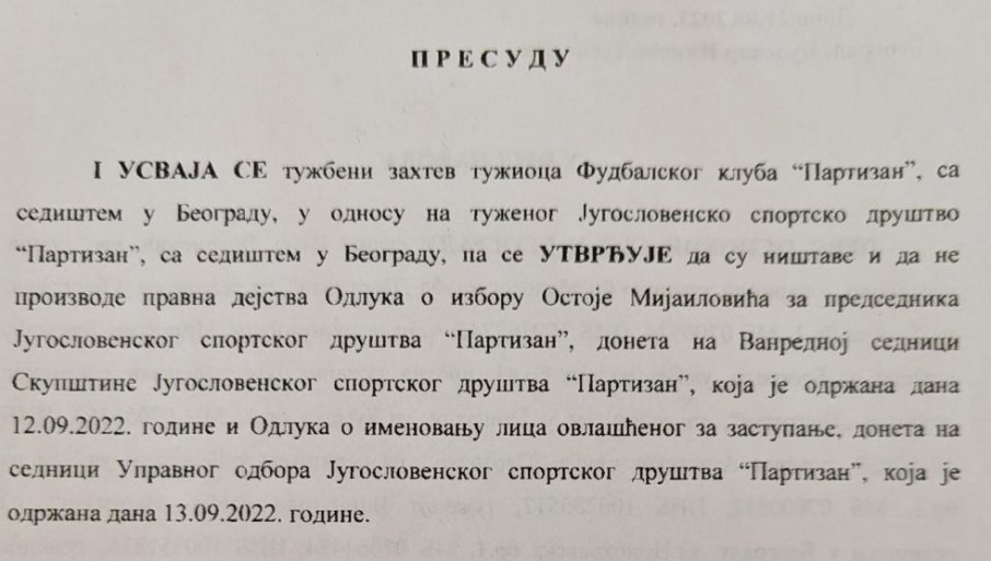 - Usvaja se tužbeni zahtev tužioca FK Partizan sa sedištem u Beogradu u odnosu na tuženog Jugoslovensko sportsko društvo Partizan, sa sedištem u Beogradu, pa se utvrđuje da su ništave i da ne proizvode pravna dejstva. Odluka o izboru Ostoje Mijailovića za predsednika JSD Partizan doneta na Vanrednoj sednici Skupštine JSD Partizan, koja je održana dana 12. 9. 2022. godine i Odluka o imenovanju lica ovlašćenog za zastupanje, doneta na sednici Upravnog odbora JSD Partizan koja je održana dana 13. 9. 2022. godine - piše u presudi.