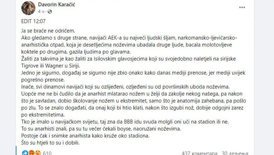 Povodom tragičnog ishoda sukoba u Atini na društvenim mrežama se oglasio pomenuti advokat, Davorin Karačić, čiju izjavu, potpuno zgroženi, prenose i grčki mediji.