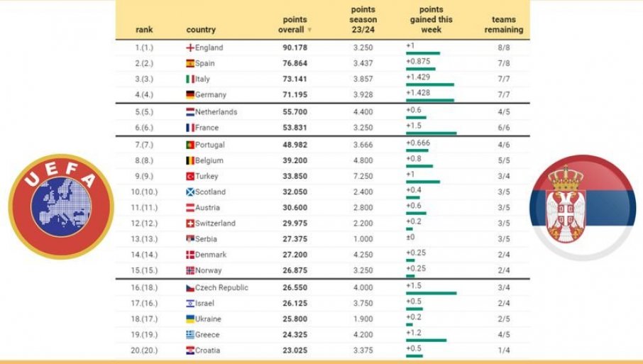 Borba u top 15 će se tek zahuktati, Srbiju koja je 13. i Ukrajinu (18) trenutno deli tek nešto više od jednog i po boda (1,500). Tužna realnost je i da smo jedina zemlja u top 20 koja ove nedelje nije uzela ni bod.
