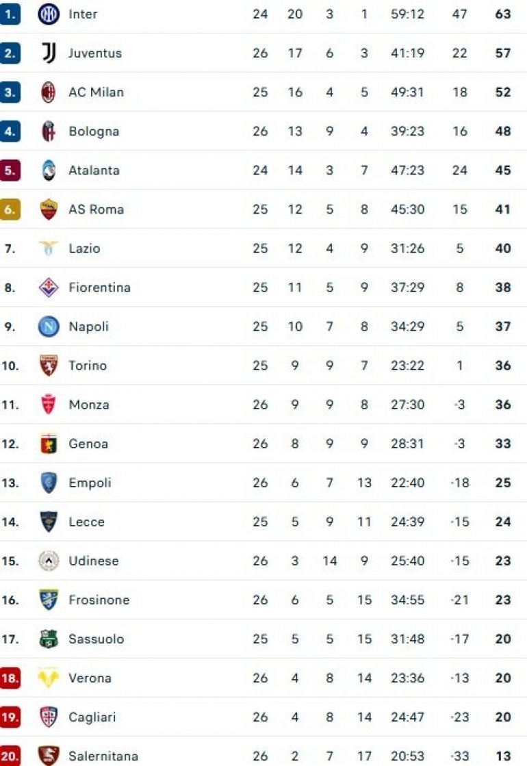 Napoli je sada deveti na tabeli Serije A sa 37 bodova, i zaostaje 11 za Bolonjom koja je četvrta, a to je mesto koje vodi u Ligu šampiona. Kaljari je na 19. poziciji sa 20 bodova.ž