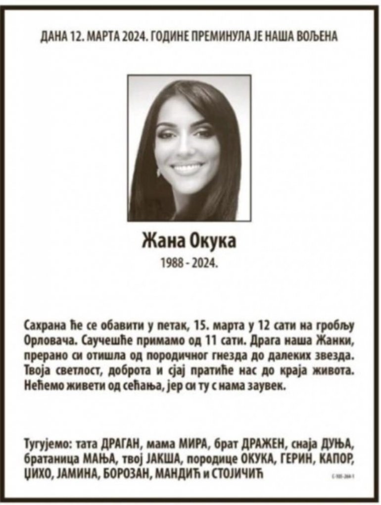 Žana je rođena 14. jula 1988. godine, a sahrana će se obaviti u petak, 15. marta, u 12 časova na groblju Orlovača.