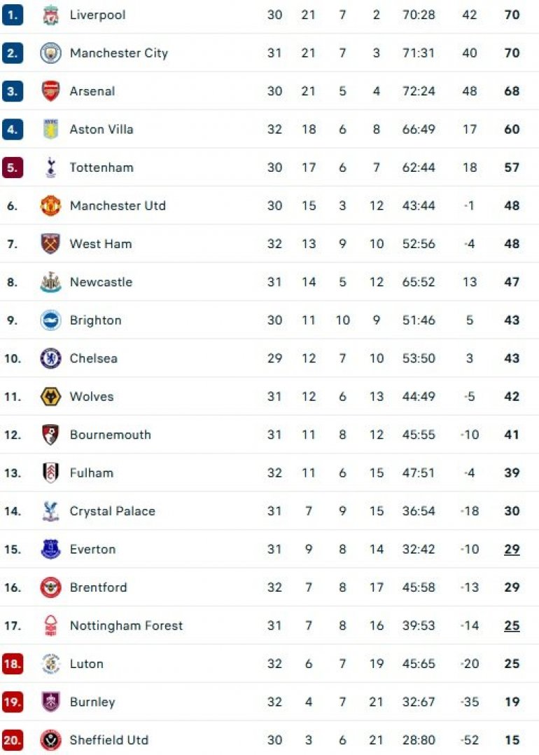 Ekipa iz Birmingema je i dalje četvrta na tabeli sa 60 bodova, ima tri više od Totenhema kao i dve utakmice više. Brentford je na 16. mestu sa 29.