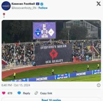 - Brat neće povrediti brata, on se ne dogovara sa vekovnim neprijateljima - glasila je jedna poruka sa tribina, a kada se zna da su iz VIP lože stadiona "Fadilj Vokri" u Prištini meč gledali premijer tzv. Kosova Aljbin Kurti i ambasador Albanije na tzv. Kosovu Petrit Malaj, može se pretpostaviti da je poruka bila upućena njima.