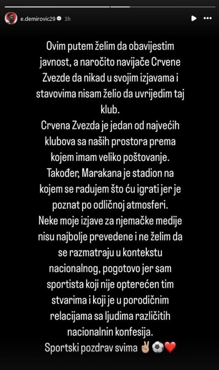 - Ovim putem želim da obavestim javnost, a naročitno navijače Crvene zvezda da nikad u svojim izjavama i stavovima nisam želeo da uvredim taj klub. Crvena zvezda je jedan od najvećih klubova sa naših prostora prema kojem imam veliko poštovanje. Takođe, "Marakana" je stadion na kojem se radujem što ću igrati jer je poznat po odličnoj atmosferi. Neke moje izjave za nemačke medije nisu najbolje prevedene i ne želim da se razmatraju u kontekstu nacionalnog, pogotovo jer sam sportista koji nije opterećen tim stvarima i koji je u porodičnim relacijama sa ljudima različitih nacionalnih konfesija. Sportski pozdrav svima - napisao je Demirović na "Instagramu".