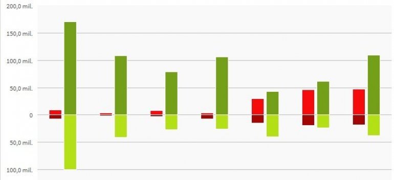 18.04 - Pogledajte kako se u poslednjih sedam godina kretala zarada Zvezde (crvenom bojom) u odnosu na Lilovu (zeleno) kako su se (u donjoj polovini grafikona) razlikovali troškovi ova dva kluba: