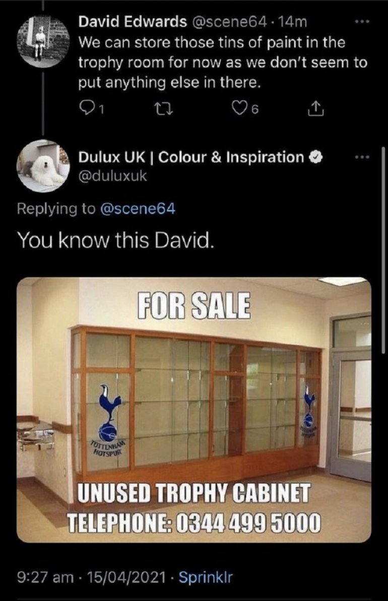 Na to je neko sa zvaničnog Tviter naloga firme odgovorio postavljanjem poznatog mima sa oglasom za prodaju nekorišćenih vitrina za trofeje sa grbom Totenhema.