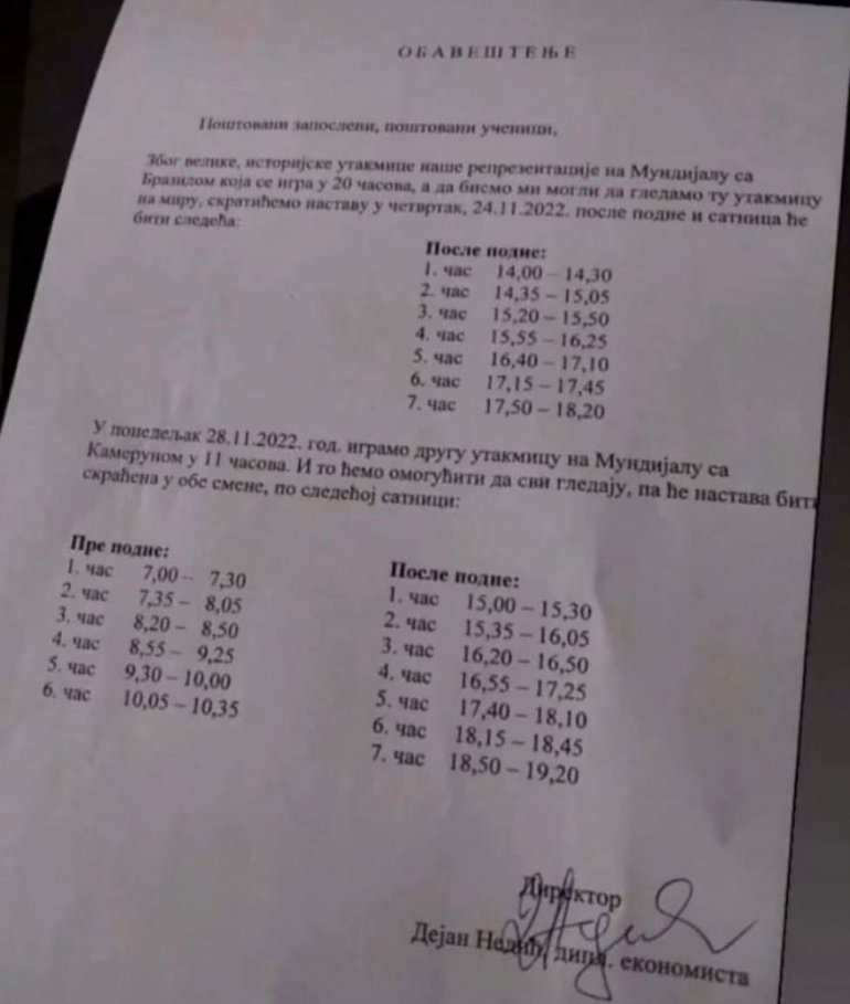 Direktor Druge ekonomske škole kaže i da je juče ministar prosvete u Hrvatskoj doneo odluku da ne bude nastave u školama zbog utakmice nacionalnog tima sa Marokom.
