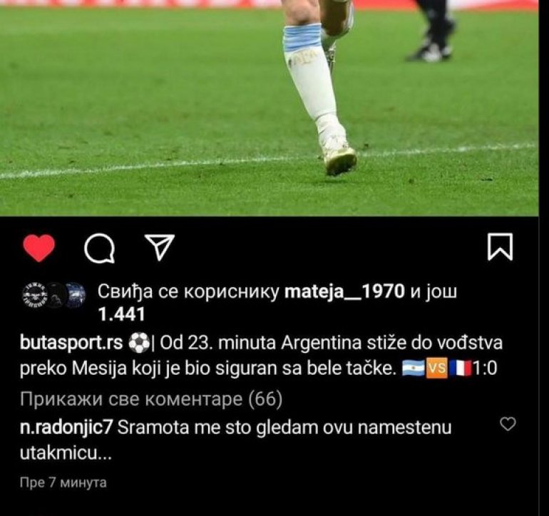 Nemanja Radonjić je na jednoj Instagram stranici ostavio komentar nakon vodećeg gola Argentine, koji je postigao Lionel Mesi sa penala.