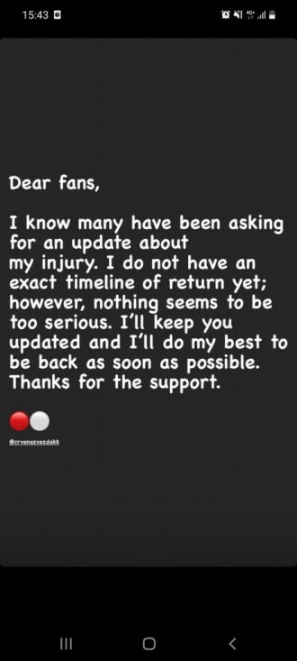 - Znam da su se mnogi raspitivali za novosti u vezi s mojom povredom. Ne mogu da vam dam tačno vreme povratka, ali kako izgleda, povreda nije ozbiljna. Obaveštsavaću vas o novostim i trudiću se da se to pre vratim. Hvala na podršci - napisao je momak iz Arizone.