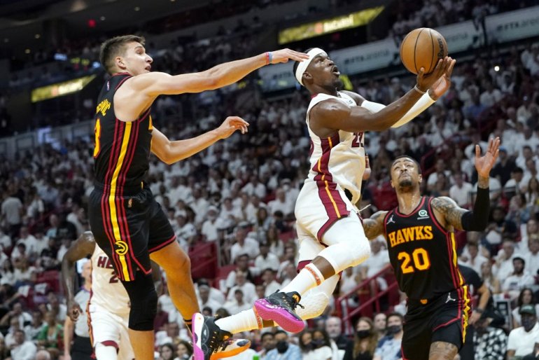Džimi Batler u prodoru pored Bogdana Bogdanovića na 1. plej-of meču Majami - Atlanta / FOTO: Tanjug/AP