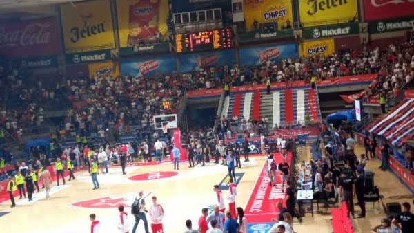 Naime, tribine su trenutno ispražnjene, ali se čeka i raščišćavanje hodnika u dvorani, tek nakon toga igrači i sudije vratiće se na teren.