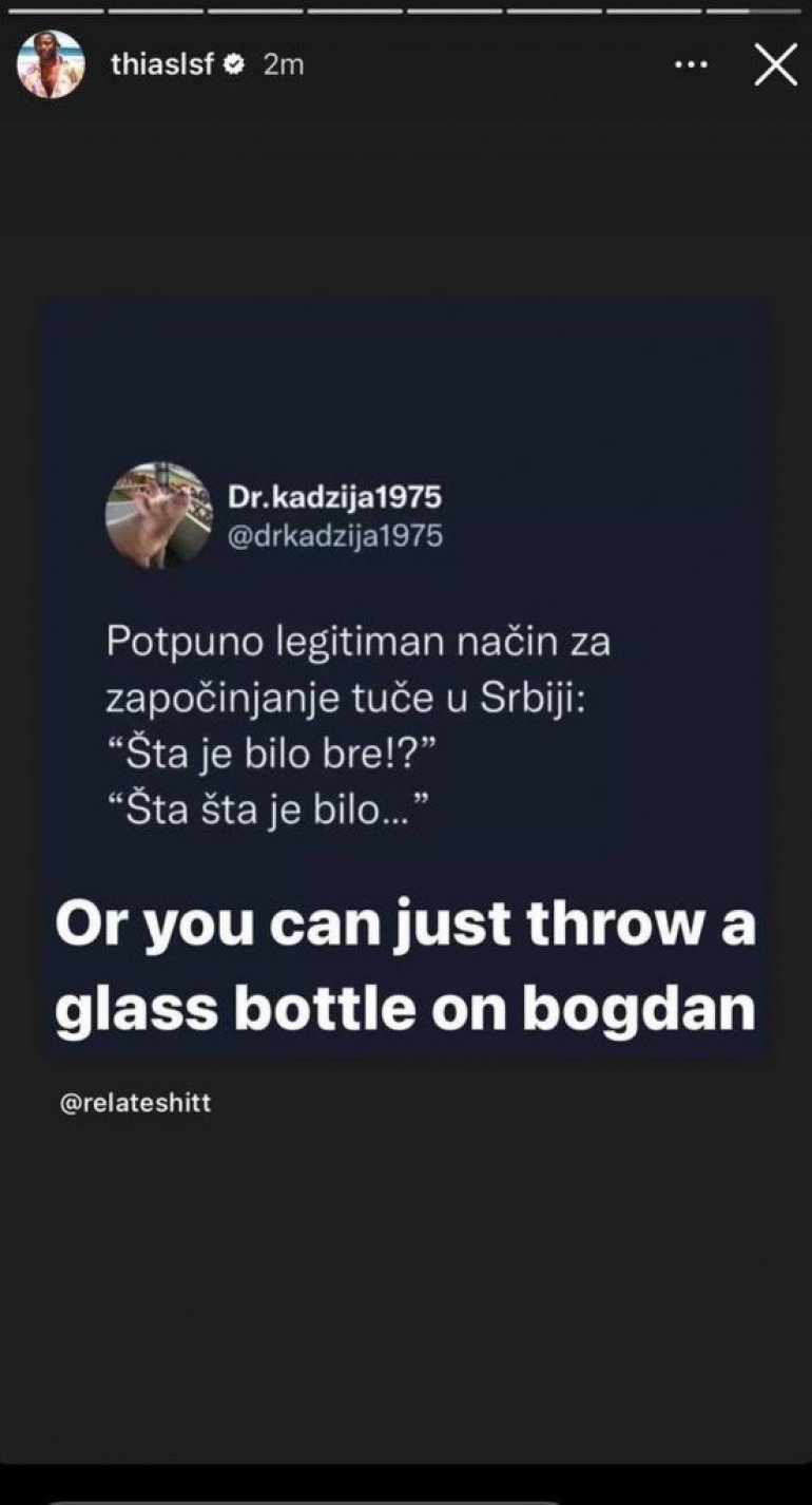 Tako je Lesor podelio na svom Instagram storiju jedan šaljiv tvit o tome kojim rečima se započinje tuča u Srbiji, a potom rekao i na koji još način se može izazvati incident.