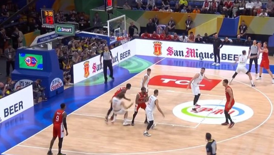 38' - Kakva odbrana Srbije, dva napada zaredom, Bogdanović poentira u prodoru, potom u novoj kontri i Davidovac, Srbije odlazi na 95:79, srpki navijači u hali u transu pevaju "Serbia's on fire"