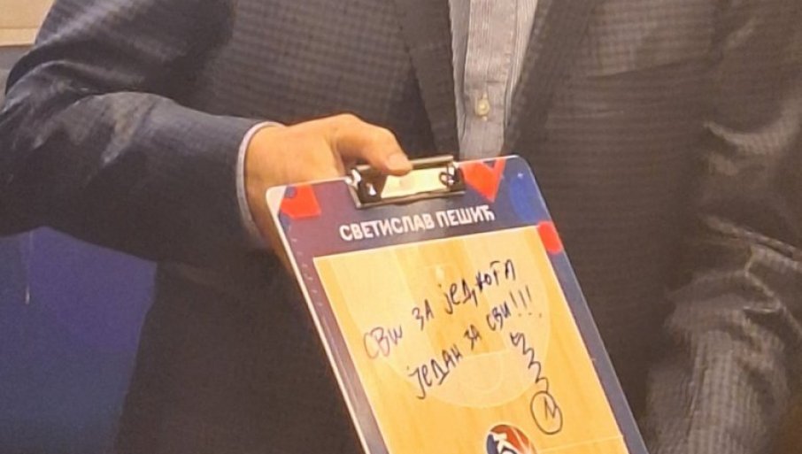 Svetislav Pešić je od Košarkaškog saveza dobio tablu sa svojim imenom, a markerom koji mu je takođe uručen ostavio je na toj tabli sada već čuveni slogan: