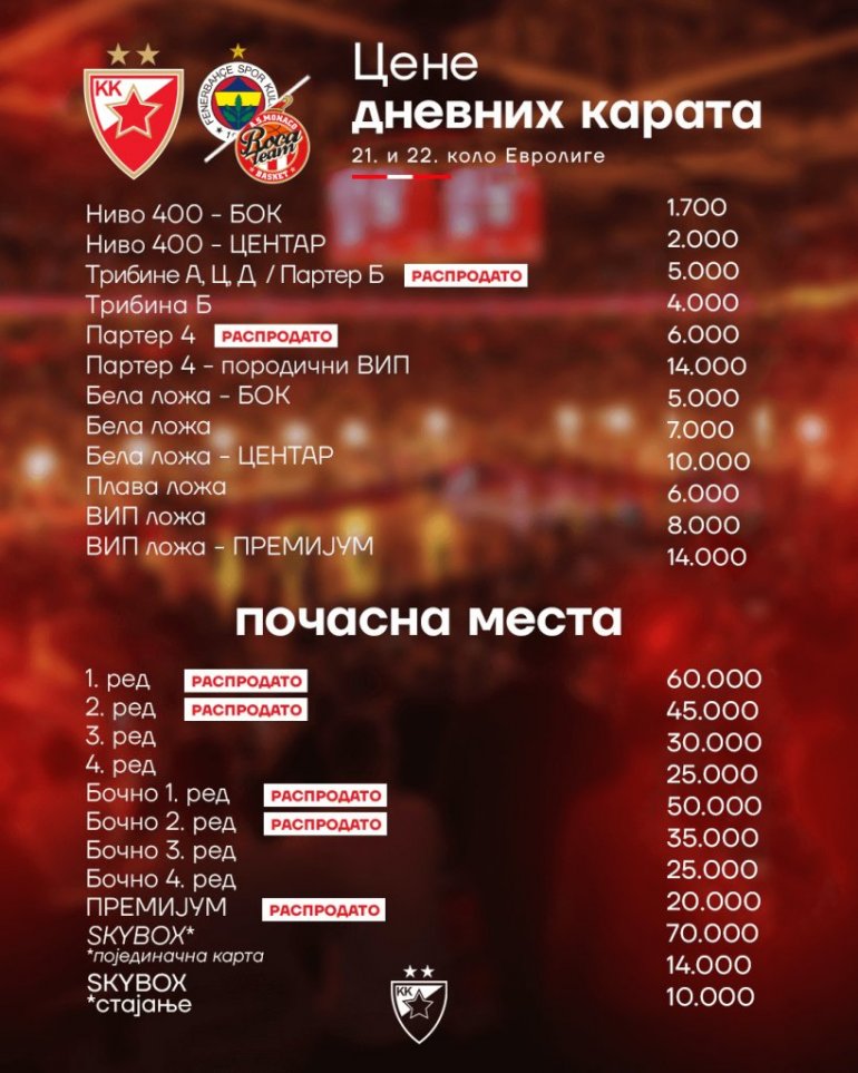 Već su rasprodata počasna mesta koja koštaju 60 hiljada dinara, 50.000, 45.000, 35.000 i 20.000 dinara, kao i tribine A, C, D i parter B (po 5.000 dinara), te Parter 4 (6.000 dinara).