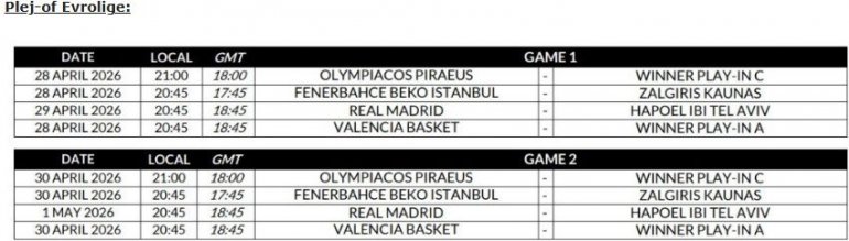 Od ranije se zna i kada startuje plej-of serija crveno-belih iz Pireja – u utorak, 28. aprila, od 20.00. Revanš, takođe u Dvorani mira i prijateljstva na programu je već dva dana kasnije, u istom terminu.