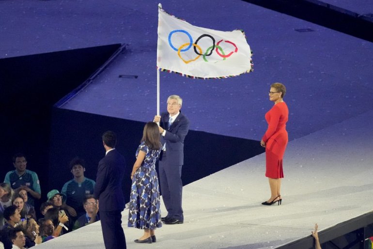 Olimpijska zastava spuštena je sa jarbola i otišla je u ruke gradonačelnici Pariza Ani Dalgo, koja će je predati narednom domaćinu, Los Anđelesu, tačnije gradonačelnici tog grada Kareni Bas.