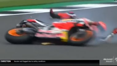 ŠPANSKI motociklista Mark Markez doživeo je težak pad na treningu Moto GP-a na Silverstonu u Engleskoj.