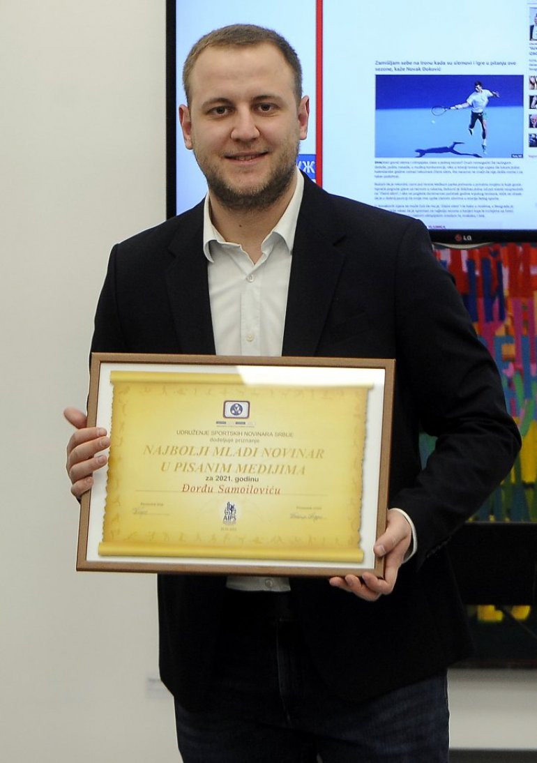 Nagrada "Zlatni mikrofon" pripala je poznatom komentatoru Gojku Andrijaševiću sa "Sport kluba", dok je dobitnik "Zlatnog pera" Darjan Nedeljković sa portala "Mocartsport", a priznanje "Branka Prelević" pripalo je Snežani Pantović (Radio Beograd). POBEDNIK Đorđe Samoilović/FOTO: M. Vukadinović