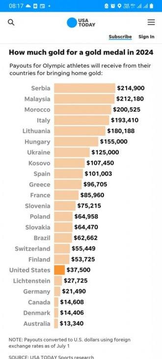 Ovo je pokazalo veliko istraživanje USA Today, koji je komunicirao sa predstavnicima više od 40 nacionalnih olimpijskih komiteta. Na drugom mestu iza Srbije je Malezija, koja za zlato plaća 212 hiljada dolara, dok je treći Maroko sa iznosom od 200.525 zelenih novčanica.