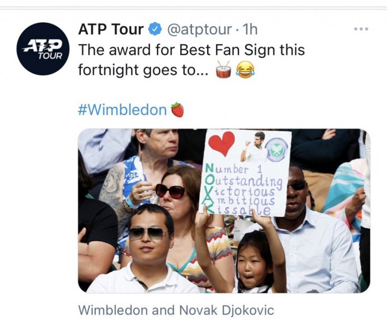 Ona je ceo meč držala plakat na kome je od početnih slova Novakovog imena nabrojala njegove vrline.