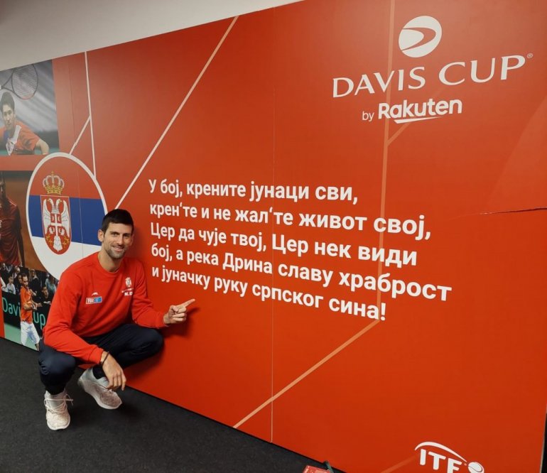 - U boj, krenite junaci svi, kren'te i ne žal'te život svoj, Cer da čuje tvoj, Cer nek vidi boj, a reka Drina slavu hrabrost i junačku ruku srpskog sina - stoji na tabli u pres-sali teniskog centra, a Novak Đoković pozirao je pred citatom koji će mu sigurno biti velika motivacija.