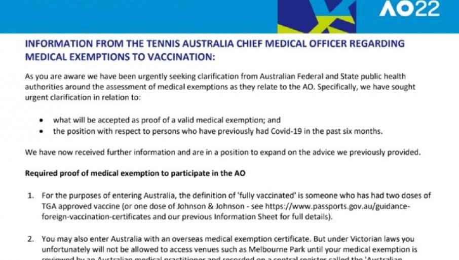 Mesec dana ranije Federalna Vlada obavestila je Teniski savez Australije da neće biti dovoljno da ljudi prilože potvrdu o preležanom kovidu za putovanje kroz zemlju, već da će morati da prilože potvrdu o vakcinaciji.