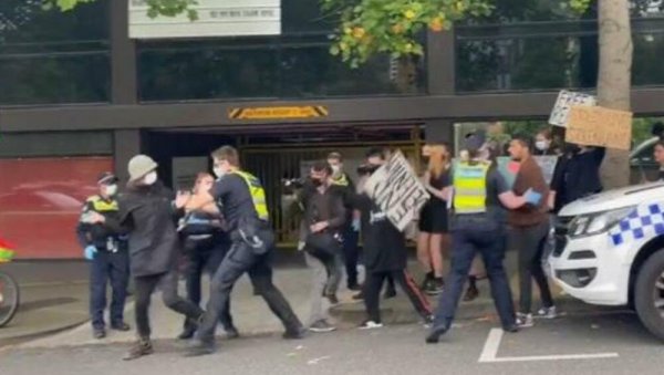 Policijske snage privode ljude ispred hotela u kome se nalazi Đoković. Reč je o migrantskim protestantima.