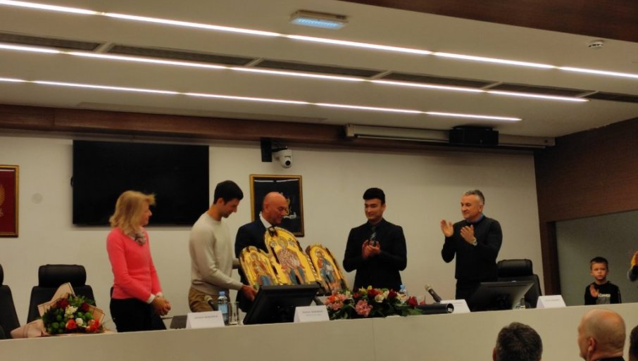 Novaku Đokoviću je uz povelju Počasnog građanina uručena i ikona Triptih Svetog Nikole, autora Zorana Beletića. Kako ona izgleda pogledajte u posebnoj galeriji.