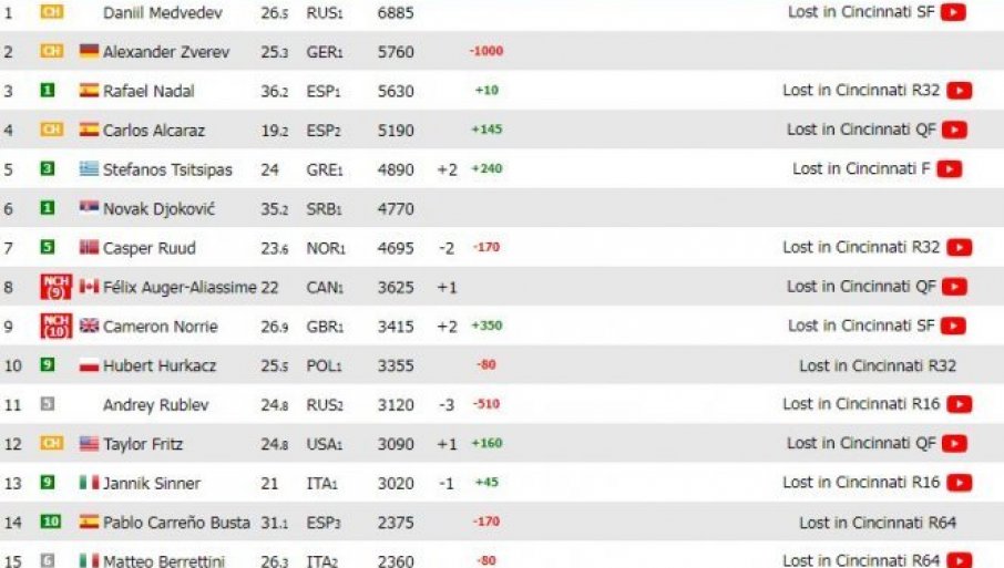 Prvi teniser sveta je i dalje Danil Medvedev sa 6.885 poena, ali Rus mora da odbrani titulu na Ju Es openu koji počinje 29. avgusta kako bi ostao na tronu.