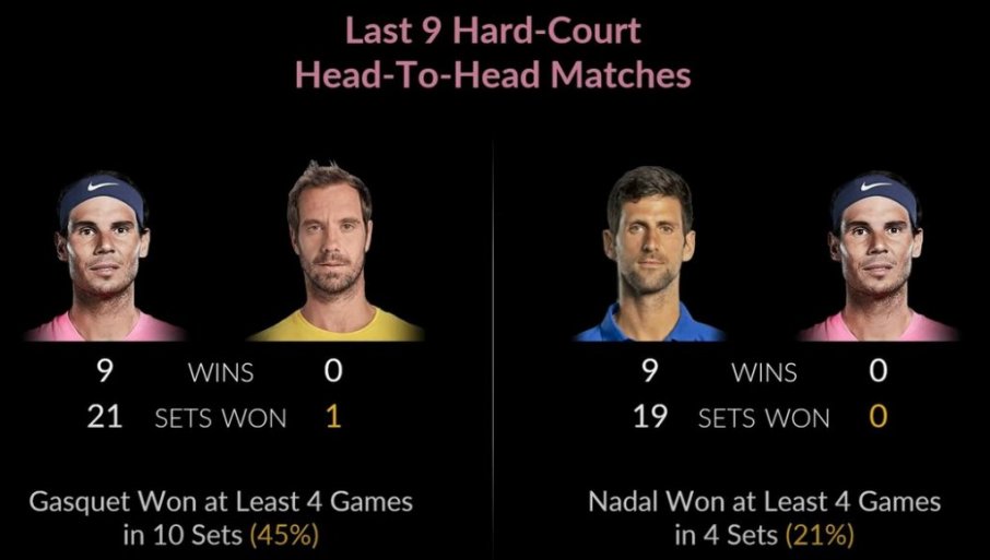 Nadal je u tih devet mečeva sa Gaskeom ostvario devet pobeda, uz impresivnih 21:1 u osvojenim setovima.