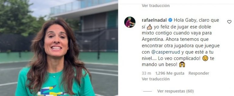 - Zdravo, Gabi. Naravno! Bio bih srećan da igram u mešovitom dublu s tobom kada dođem u Argentinu. Sad samo moramo da nađemo neku igračicu koja je na tvom nivou, da ona bude partnerka Kasperu Rudu. Vidim da će to biti komplikovano - poručio je Rafa uz grafički prikaz namigivanja, pa tome dopisao: